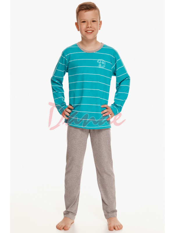 Tyrkysové tričko, s dlhým rukávom, okrúhly výstrih, zdobené tenkými prúžkami a malou potlačou chameleona na hrudi.