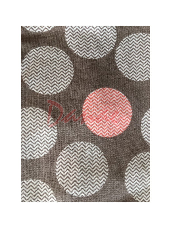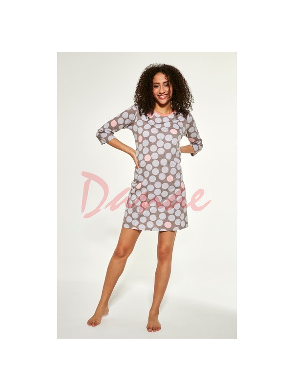 Dámska vzorovaná nočná košeľa - Judie. Dámska nočná košeľa, s trojštvrťovým rukávom. Okrúhly výstrih je s farebnou lemovkou. Dĺžka do pol stehien. Vzor - veľké bodky, dvoch farieb, detail vzoru je na poslednom obrázku.