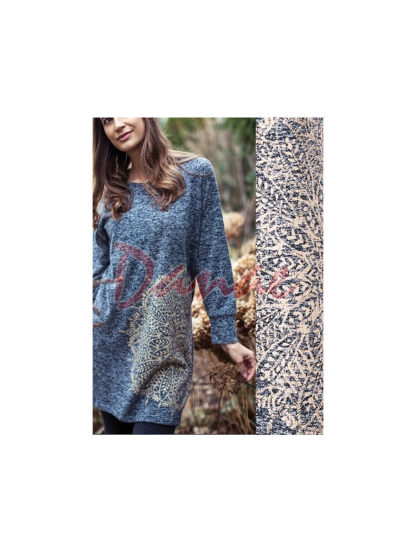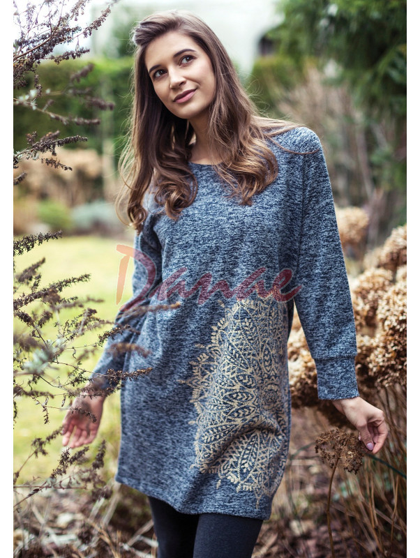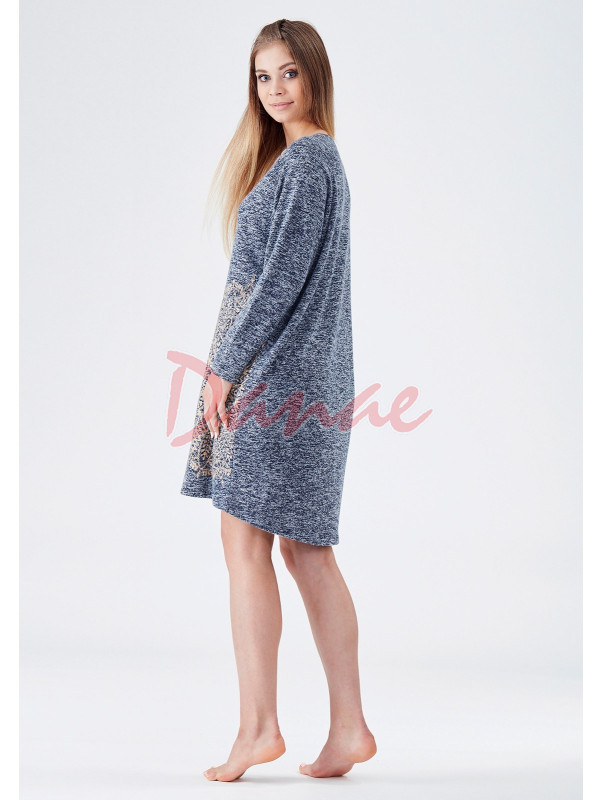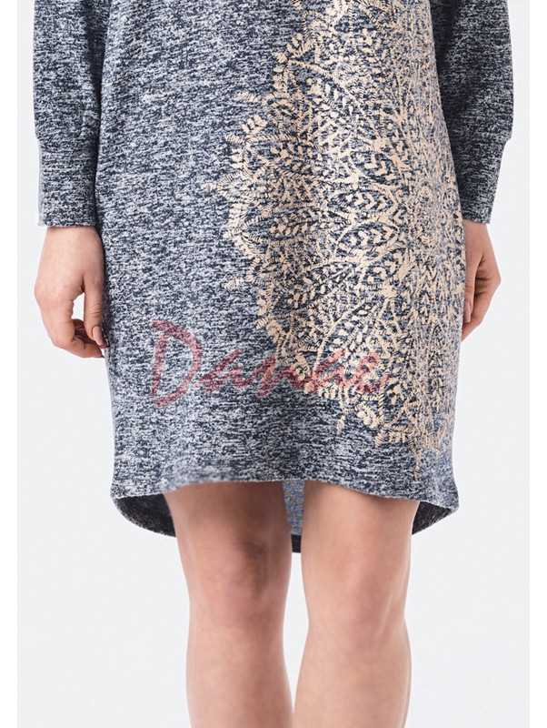 Pohodlná dámska nočná košeľa, z mäkkého materiálu, príjemného na dotyk, s originálnou zlatou potlačou. Rukávy sú zakončené manžetou. Spodný okraj vzadu je mierne predĺžený.
