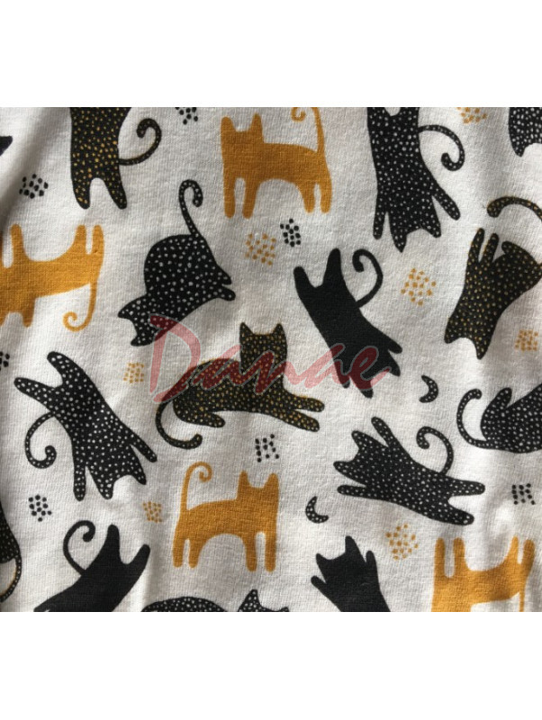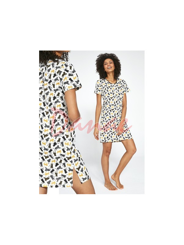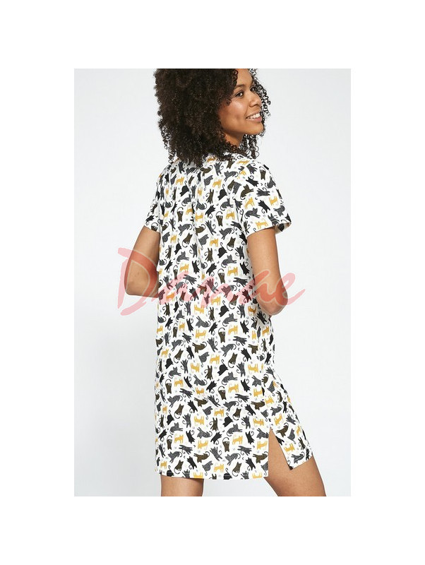 Pohodlná dámska nočná košeľa, s krátkym rukávom, výstrih pokračuje légou, rozopínateľnou na gombičky. Košeľa je celovzorovaná motívom mačky. Dĺžka nad kolená, na spodu - po stranách sú rozparky.