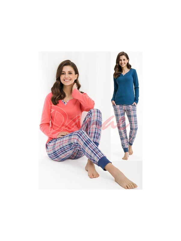 Jednofarebné tričko, s dlhým rukávom, výstrih s malým véčkom, ozdobeným lemom, korešpondujúcim so vzorom na nohaviciach.
