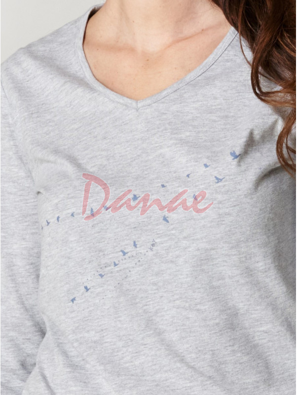Šedé tričko, s dlhým rukávom, véčkový výstrih. Predná časť trička je zdobená jemnou potlačou - znázorňuje letiace vtáky.