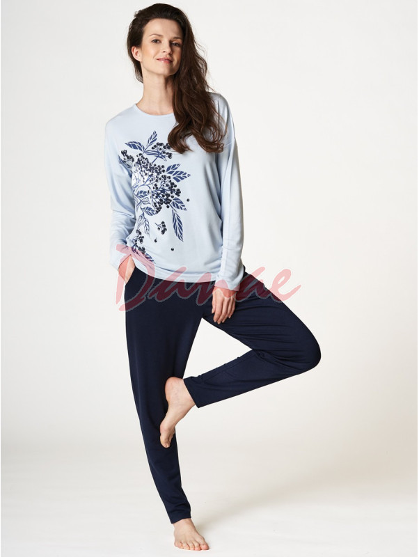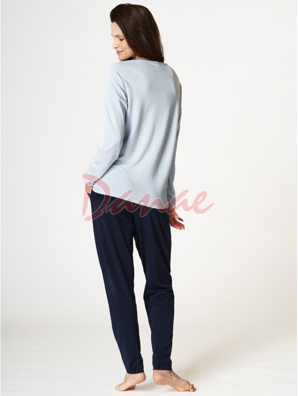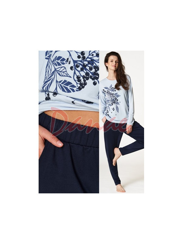 Dámske pyžamo, s dlhým rukávom a okrúhlym výstrihom, na prednej strane zdobené potlačou čierna baza.