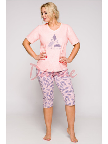 Dámske trojštvrťové pyžamo Eliza, z vysokokvalitnej bavlny. Tričko s krátkym rukávom, výstrih do véčka, zdobené potlačou: listy v trojuholníku a nápis: Dream. Nohavice sú trojštvrťové, vzorované, v páse do gumy.