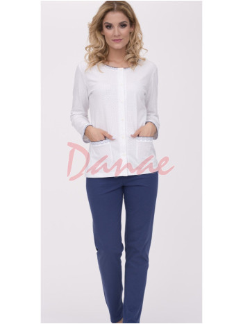 Dámske pyžamo na rozopínanie, s kvetovým zdobením dekoltu a manžet rukávov. Biela halenka, s jemným bodkovaným vzorom, má dlhý rukáv a je celá na rozopínanie, na gombíky. Do kompletu dlhé tmavomodré nohavice. Pyžamo je ušité z veľmi kvalitnej bavlny.