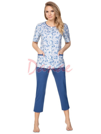 Pyžamo na rozopínanie - Flora. Decentne, kvietkovo vzorovaný vrchný diel, na rozopínanie - na gombíky. Krátky rukáv, okrúhly výstrih, po bokoch dve praktické vrecká. Jednofarebné trojštvrťové nohavice, v páse do gumy.