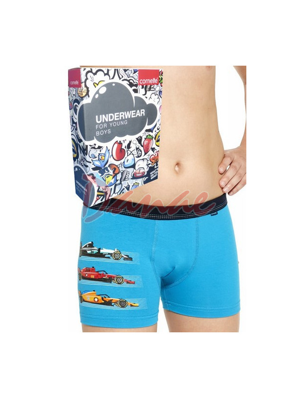 Priliehavé elastické boxerky pre chlapcov, na jednej nohavičke s potlačou - tri pretekárske autá formule.