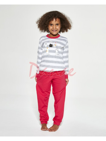 Dievčenské pyžamko, s dlhým rukávom. Pruhované tričko, je zdobené potlačou s mačiatkami. Lemovka, okolo výstrihu, a patenty na rukávoch aj na spodnom okraji trička, sú vo farbe nohavíc. Kontrastné, jednofarebné, dlhé nohavice, na spodu zakončené patentom. Pyžamko, pre milovníčky mačiatok, je balené v krabičke Cornette.