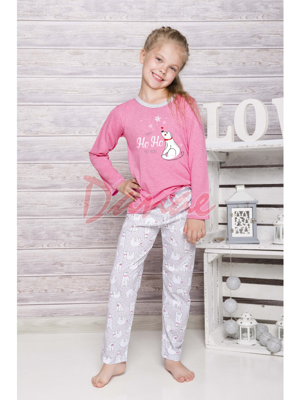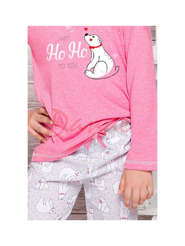 Jednofarebné ružové tričko, na prednej strane s potlačou: Biely medveď, s mašličkou na krku, nápis: Happy Ho Ho to you.