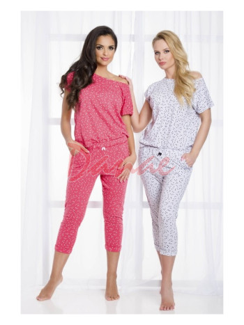 Dámske pyžamo, s bielymi srdiečkami - Inka. Dámske pohodlné pyžamo, či pohodlné domáce oblečenie - celé červené, s bielymi srdiečkami. Tričko, s krátkym rukávom, veľký lodičkový výstrih. Trojštvrťové nohavice, s vreckami.