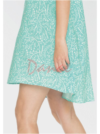Ľahké a vzdušné dámske letné šaty - košielka, vyrobená z jemného a vzdušného viskózového materiálu. Model má široké ramienka a velký výstrih, zdobený šnúrkami s bambuľkami. Zadný diel je zľahka predĺžený. Svieža farba, s kvetinovým vzorom.