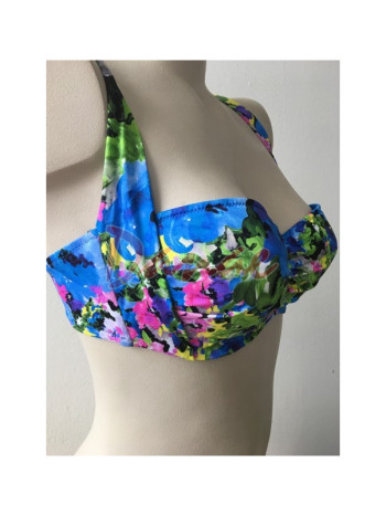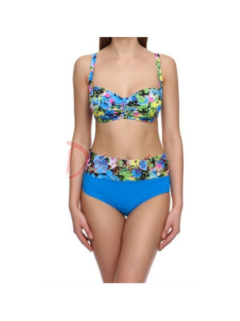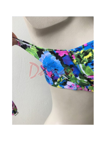 Samodržiace plavky s kvetovým vzorom, s modelujúcou podšívkou na nohavičkách, vhodne korigujú drobné nedostatky postavy. Samodržiaca podprsenka, typu bardot, polovystužená, bez push-up vypchávok, s kosticami a bočnými kosticami, ideálne drží a modeluje aj väčšie poprsie. Ramienka sú vzadu odopínateľné, dajú sa zaviazať okolo krku, prípadne na chrbáte. V strede podprsenky je ozdobná šnúrka s korálkami. Nohavičky, klasického strihu, majú široký pás, ten sa dá preložiť podľa vášho vkusu a potreby.