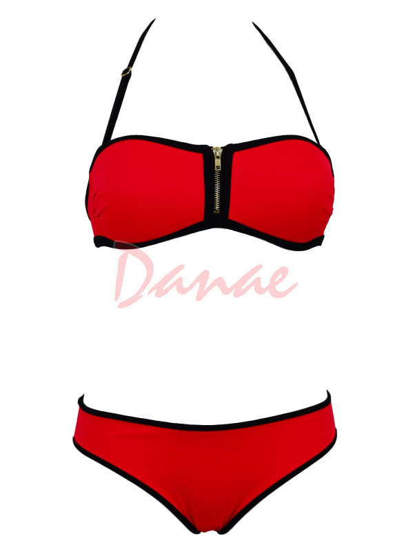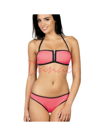 Samodržiace plavky push-up - Lorin L2043. Mäkké tvarované košíky, s vyberateľnou push-up vkladkou, ramienko okolo krku sa dá odopnúť. Zips v strede podprsenky, dá sa rozopnúť. Farba žiarivá, koralová, s kontrastným čiernym lemom.