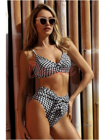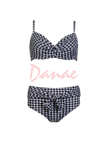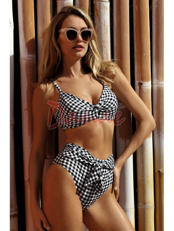 Vichy Look - dvojdielne plavky v retro štýle, určené predovšetkým na väčšie prsia. Mäkký košík s kosticou, je spevnený ďalšou vrstvou s nariasením, a zároveň je podšitý korigujúcou podšívkou. Bočná kostica a nastaviteľné ramienka, zabezpečia dokonalé napasovanie a komfort pri nosení. Moderné vysoké nohavičky, zdobené mašľou, skryjú drobné nedostatky. Nestarnúca čierno-biela kombinácia, je vhodná pre všetky vekové kategórie.
