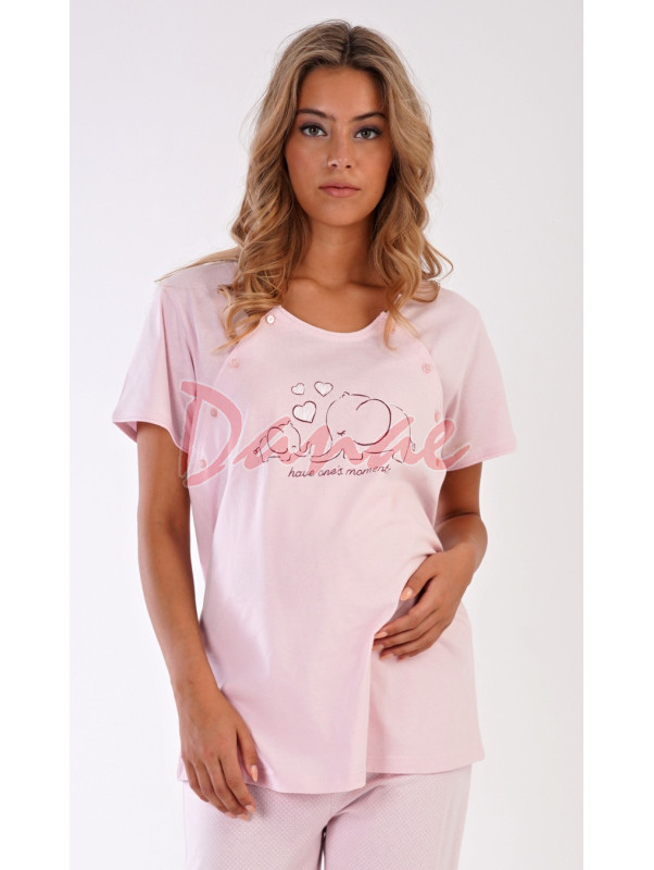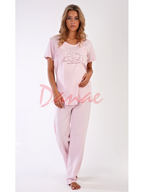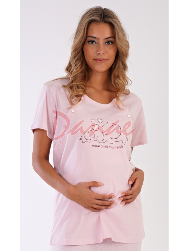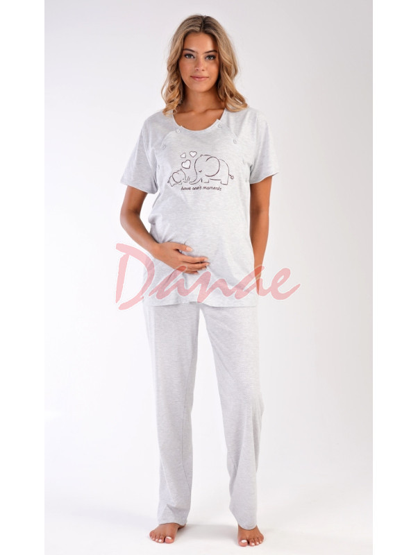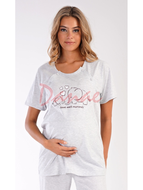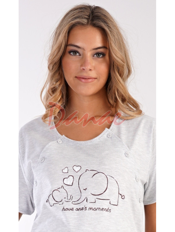 Materské pyžamo so sloníkmi - pohodlné tričko, s krátkym rukávom, je na prednej strane s obrázkom sloníkov – mama a malé sloníča a nápis: Have one´s moments. Obojstranné rozopínanie - pre pohodlné kojenie. Nohavice sú dlhé, s malými bodkami, majú v páse gumu aj šnúrku na stiahnutie.