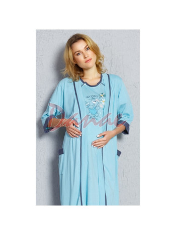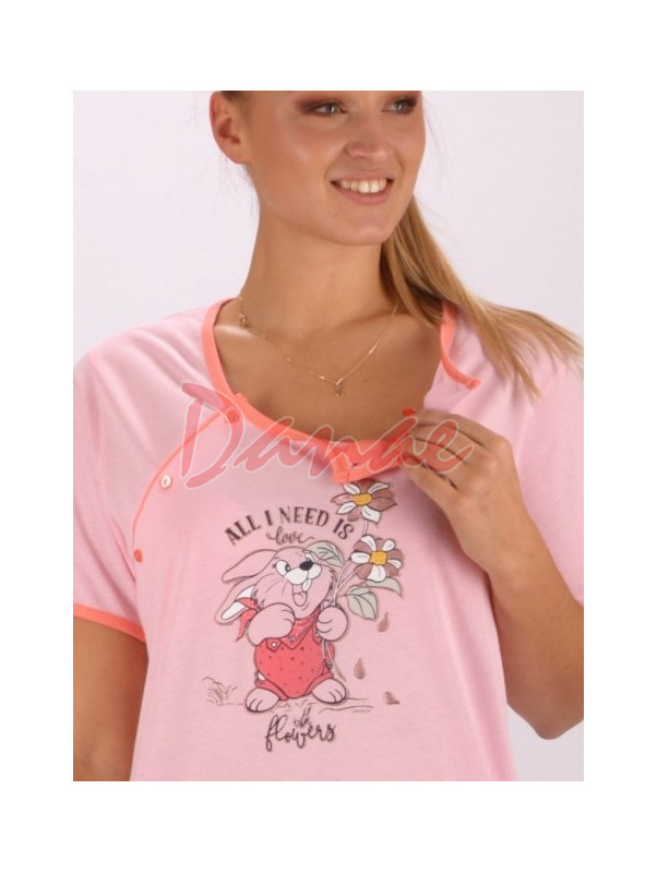 Nočná košeľa s krátkym rukávom, obojstranným rozopínaním, potlač s metalickým leskom: Zajačik s kytičkou, nápis: All I need is Love with flowers. Tenký župan, s trojštvrťovým rukávom.