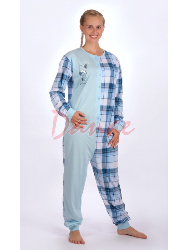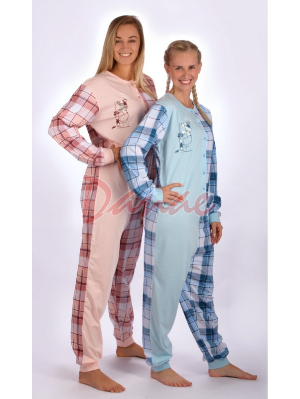 Vonku je zima - dámsky károvaný overal na spanie, s potlačou na jednofarebnej časti: medvedík v čiapke a šáliku, so strieborným detailom, nápis: Baby it´s Cold Outside. Rukávy aj spodok nohavíc sú zakončené patentom.