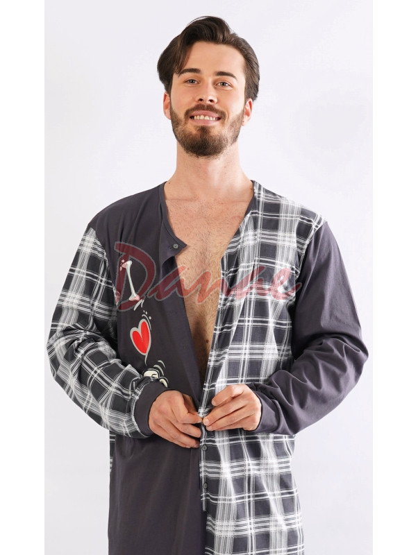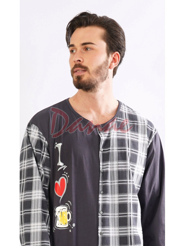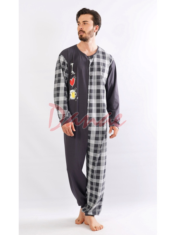 Pánsky overal, pre milovníka piva. Pánsky overal na spanie, s dlhým rukávom, vpredu na rozopínanie, na gombíky. Predok je rozdelený na jednofarebnú časť, s pollitrom piva a srdiečkom, a károvanú časť. Zadná strana overalu je celá károvaná. Rukávy ako šašo, jeden celý jednofarebný, druhý károvaný.