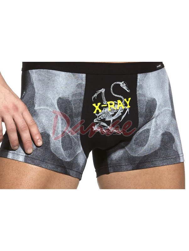 Pánske boxerky s humornou potlačou - X-ray. Boxerky s humornou potlačou: chlap pod rentgenom, naviac vpredu celá kostra vtáka! Balené v krabičke Cornette - priamo na darovanie.