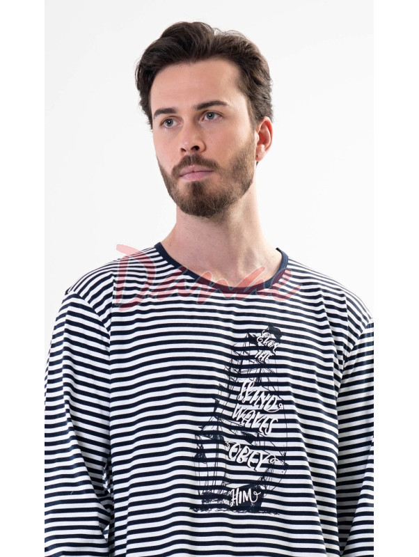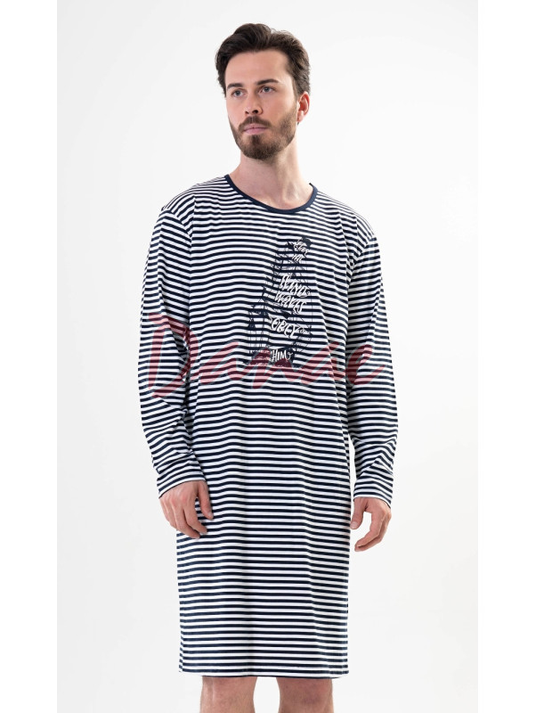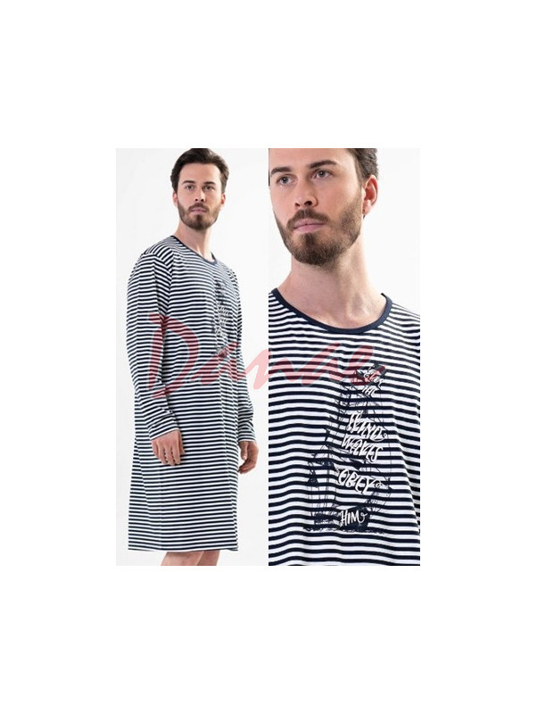 Pruhovaná pánska nočná košeľa, s dlhým rukávom, v námorníckom štýle - s obrázkom plachetnice vpredu.
