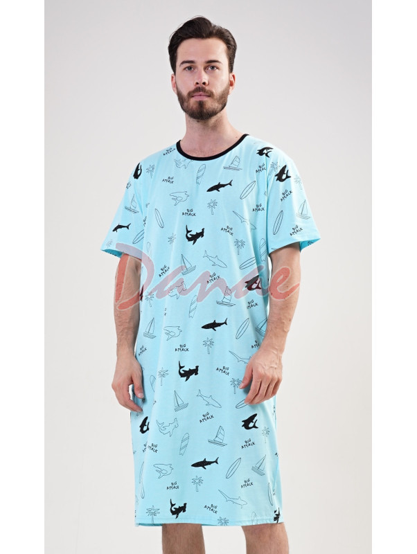 Pánska nočná košeľa s krátkym rukávom, okrúhly výstrih, po celej ploche zdobená siluetami rôznych druhov žralokov, plachetníc, surfov a paliem.