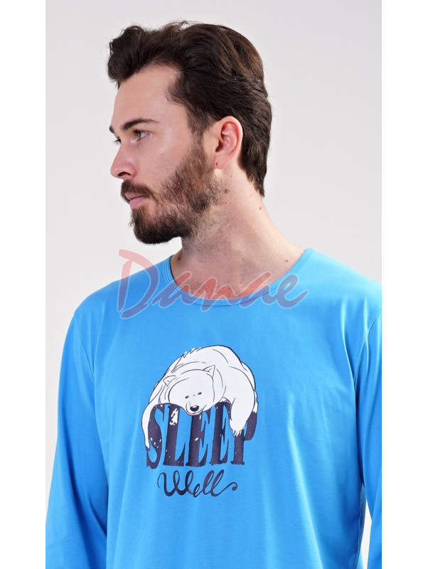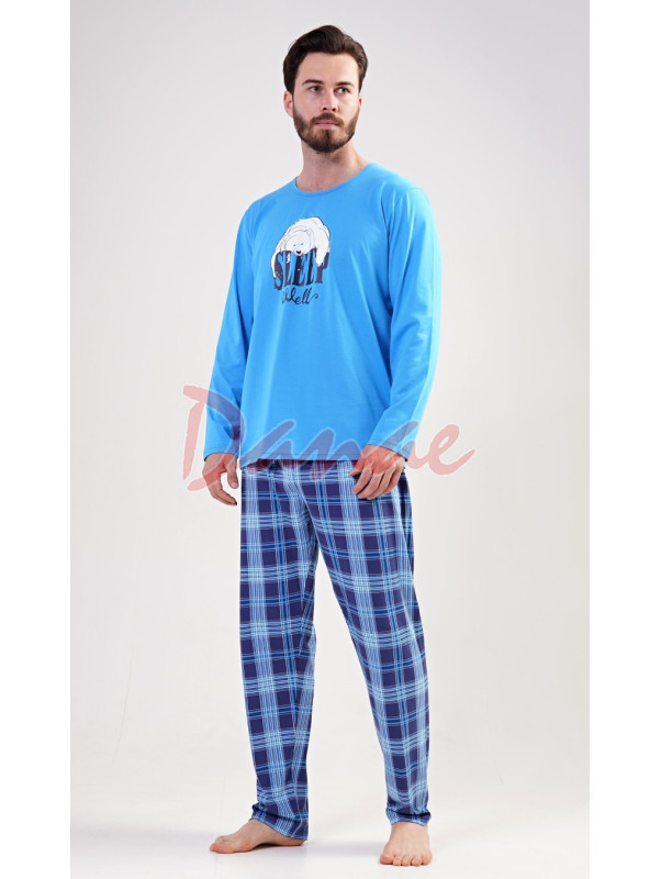 Pánske pyžamo dlhé Polárny medveď. Pánske pyžamo, s dlhým rukávom, okrúhly výstrih. Vpredu je na hrudi obrázok: Spiaci polárny medveď, pod nim nápis: Sleep Well. Nohavice sú dlhé, kárované, bez vreciek, v páse do gumy.