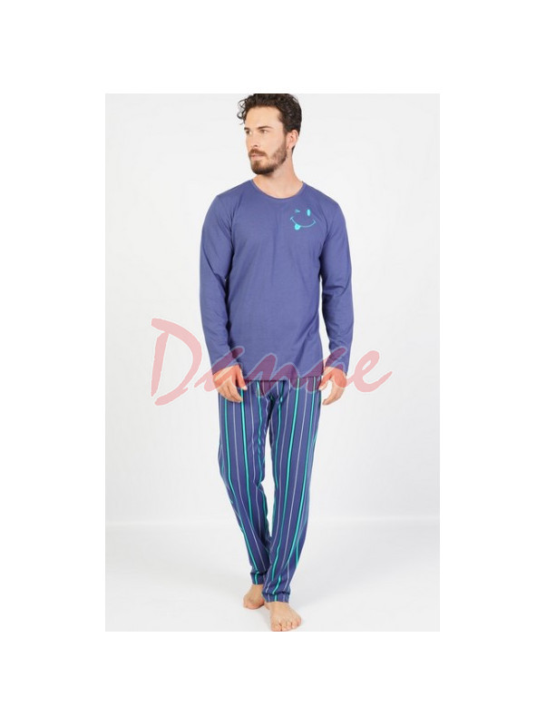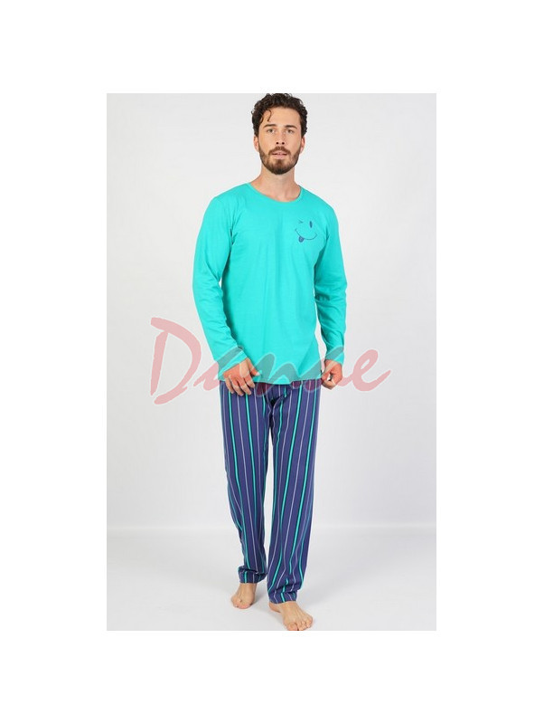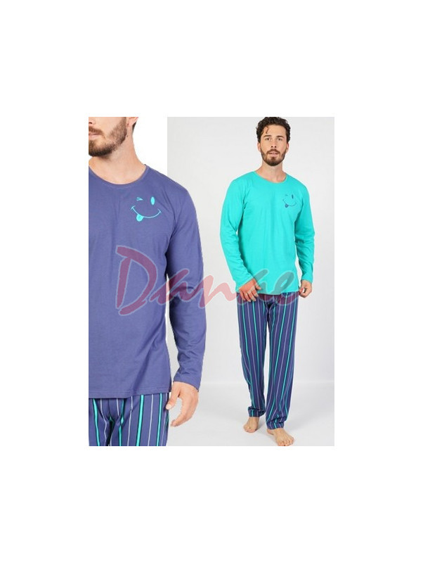 Pánske pyžamo dlhé - Emoticon - s malým smajlíkom. Tričko (zelené alebo modré), s dlhým rukávom, okrúhly výstrih, na hrudi malá potlač so smajlíkom. Do kompletu, dlhé nohavice s pruhmi, v oboch súpravách modré.