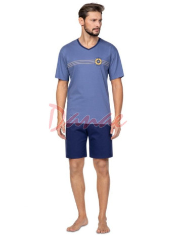 Pánske letné pyžamo - Kompas. Tričko, s krátkym rukávom, véčkový výstrih, má na hrudi malú potlač - Kompas. Jednofarebné šortky, v páse do gumy. Pohodlné, pánske, bavlnené pyžamo.