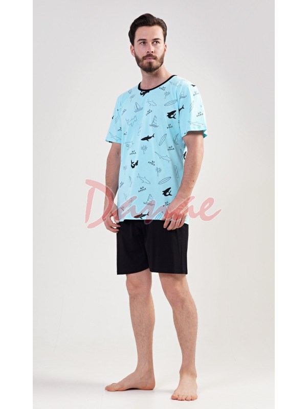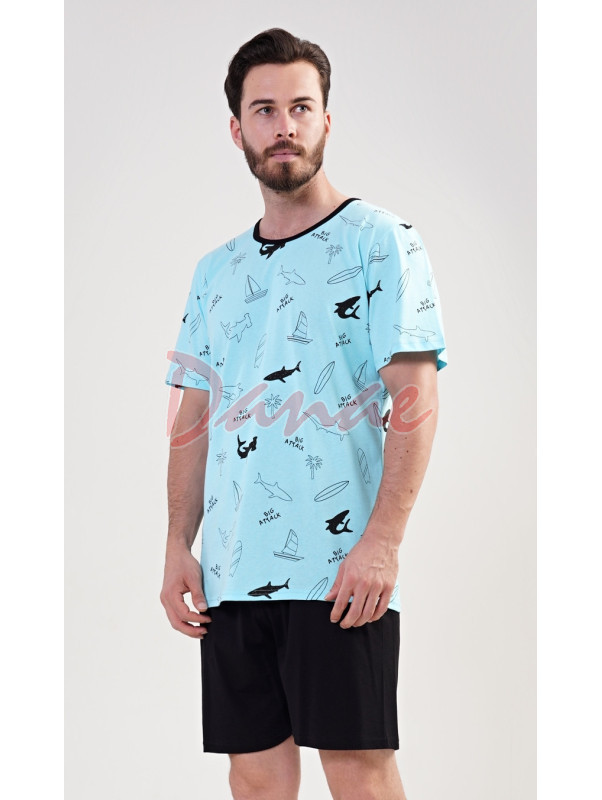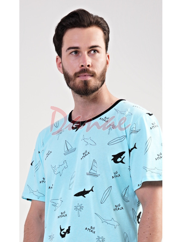 Tyrkysové tričko, s krátkym rukávom, okrúhly výstrih, po celej ploche zdobené siluetami rôznych druhov žralokov, plachetníc, surfov a paliem. Jednofarebné tmavšie šortky, s pohodlnou gumou v páse.
