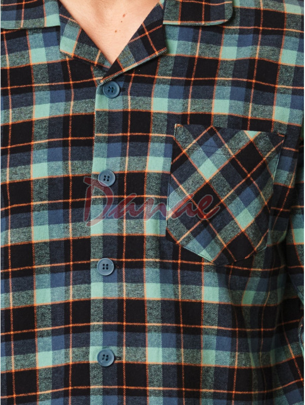 Pánske teplé pyžamo, z kvalitnej flanelovej bavlny. Vrchný diel s límčekom, s rozopínaním na gombíky, na hrudi malé vrecko. Dlhé nohavice, s vreckami na bokoch, v páse guma a gombíky. Pyžamo zaujme príjemnou zelenou farbou, s károvaným vzorom.