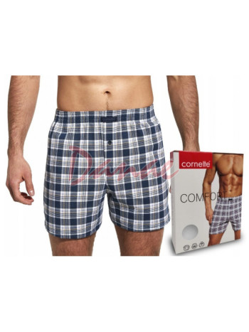 Pohodlné kárované pánske trenky, z kvalitnej bavlny, príjemnej na dotyk. Klasický strih, s rozparkom na gombík, v páse guma obšitá v tuneli, na páse nášivka s logom značky. Balené v krabičke Cornette.