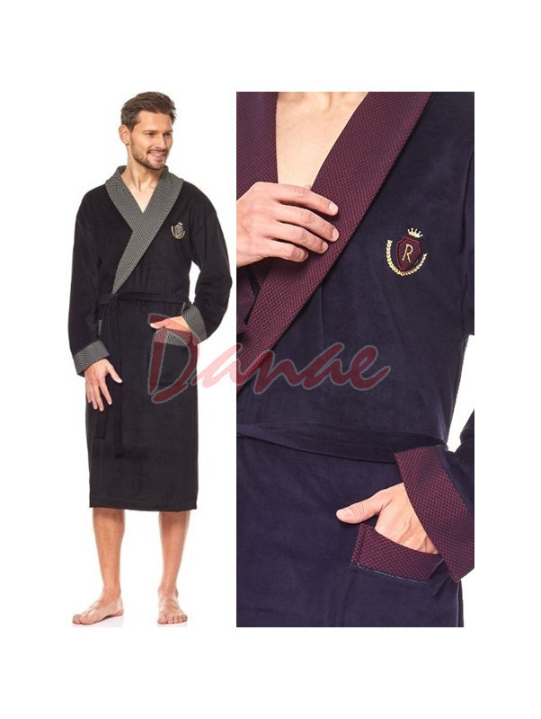 Pánsky dlhý velúrový župan, v nadmerných veľkostich. Župan je so šálovým límcom, s viazaním v páse a dvomi vreckami. Manžety na rukávoch, okraje vreciek a límec sú kontrastné, vzorované. Na hrudi malá ozdobná aplikácia - erb s písmenom R a korunkou - Royal.