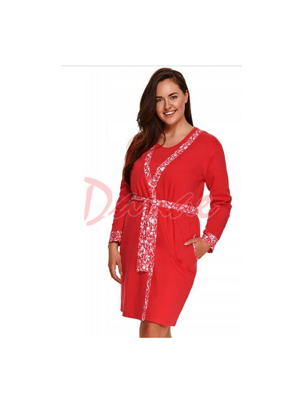 Tenký bavlnený dámsky župan, je ozdobený kontrastným lemom. Kontrastný lem je aj na manžetách, okraji vreciek a na opasku. Župan nemá kapucňu.