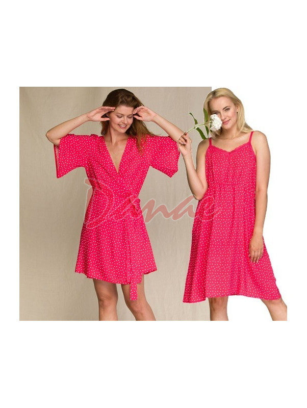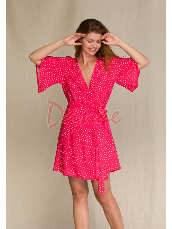 Bodkovaný župan z viskózy, s krátkym rukávom, pôsobí na dotyk hodvábnym dojmom. Kimonový strih, preložením a previazaním regulujete veľkosť výstrihu. Na bokoch vrecká. Doporučujeme doplniť aj košieľku, z rovnakého materiálu, ktorú tiež nájdete v našej ponuke.